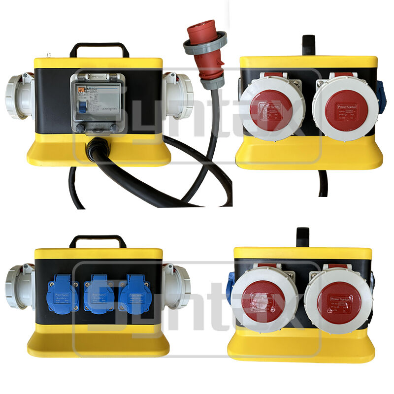 Deze 32 AMP MZ8 draagbare stroomverdeelkasten met 3e generatie industriële stekkers en contactdozen zijn op maat gemaakt voor podiumstroomverhuur. De kasten zijn geclassificeerd als 32A, 400VAC, 3P+N+E IP67 Waterdicht. De inkomende stekker is 5P 32A 400v driefasig IP67 met een 1,8m ingebouwde stroomkabel rubberen kabel, die wordt beschermd door een 4P 40A 30mA RCD. De uitgaande contactdozen zijn 4 stuks 5P 16A 400v IP67 Paneelgemonteerde Rechte contactdoos en 3 stuks 2P+E 220v 16A enkelfasige Schuko Contactdoos (Duits type), beide zonder bescherming. De kasten zijn gemaakt van PC en IP67 Waterdicht, wat perfect is voor evenementen, vooral voor podia. We kunnen op maat gemaakte stroomverdeelkasten bouwen op bestelling.