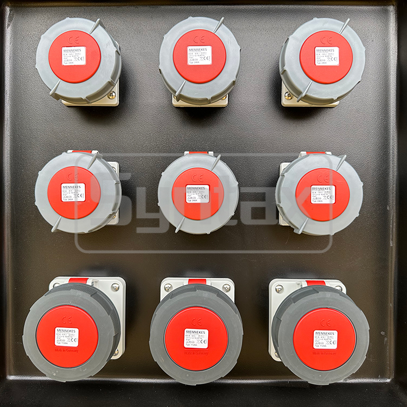 1 x 200A 400V L1+L2+L3+N+E IP67 Camlock Connectoren, beschermd door 1 x 4P 200A MCCB. |