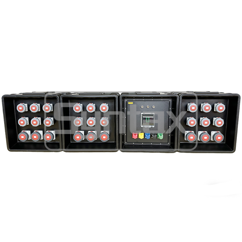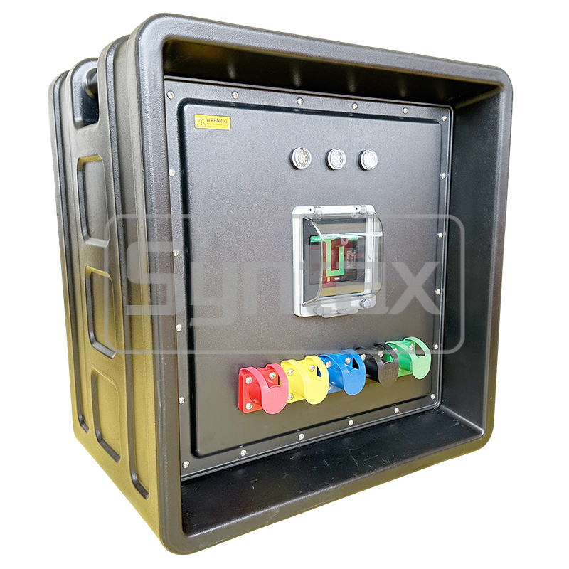 Deze 3PH 200 Amp draagbare evenementenkast voor buiten is speciaal op maat gemaakt voor tijdelijke stroomvoorziening op het podium. De inkomende set van 5 camlock connectoren wordt beschermd door een 4P 200A Schneider MCCB. De uitgaande stopcontacten zijn 3 stuks 5P 63A 400v IP67 stopcontacten en 6 stuks 5P 32A 400v IP67 stopcontacten zonder bescherming. De klant heeft het merk Industriële Stekkers en Stopcontacten van Mennekes gespecificeerd, en alle automaten van Schneider. De kasten zijn gemaakt van HDPE en IP67 waterdicht, wat perfect is voor evenementen, vooral voor podia. We kunnen op maat gemaakte stroomverdeelkasten bouwen op bestelling.