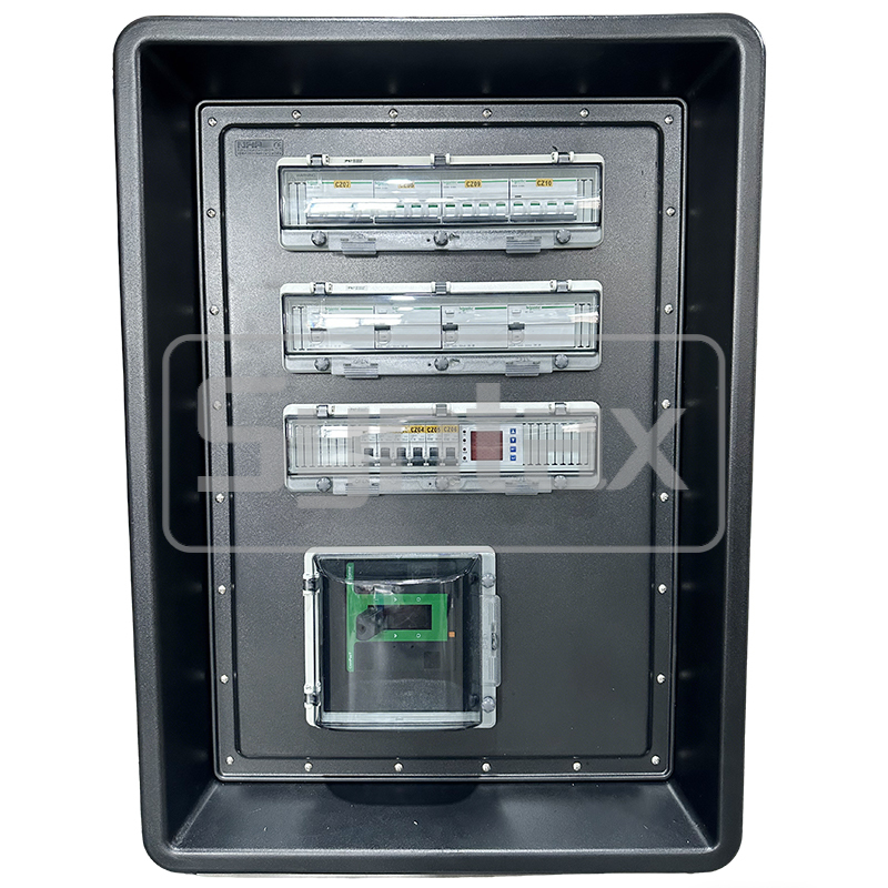 | Uitgaande 1-4 | 4× 3P 16A 220V IP67 paneelmontage stopcontacten, beschermd door 4× 1P+N 16A 30mA RCBOs |